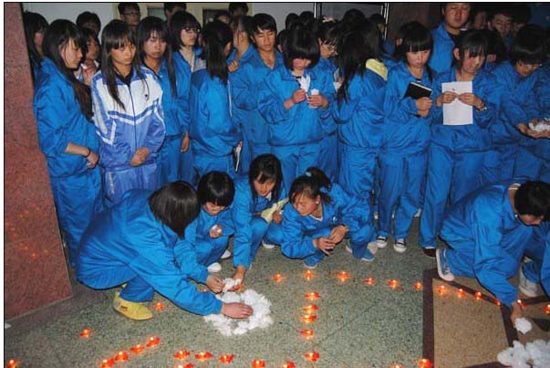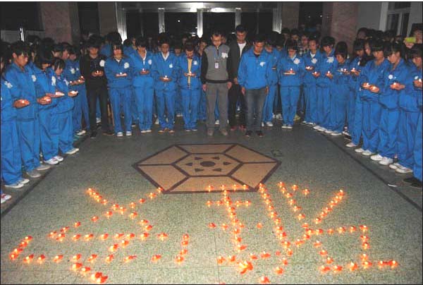 举国之殇,全国同咽。最后,同学们用手中的蜡烛,胸前的白花摆出了大小不同的心型,寄托着对灾区人民以及不幸遇难同胞的深深哀悼。烛光中,真诚的眼神饱含着千言万语,同学们希望用一束束烛光温暖灾区的人们,点亮他们重建家园的信心!