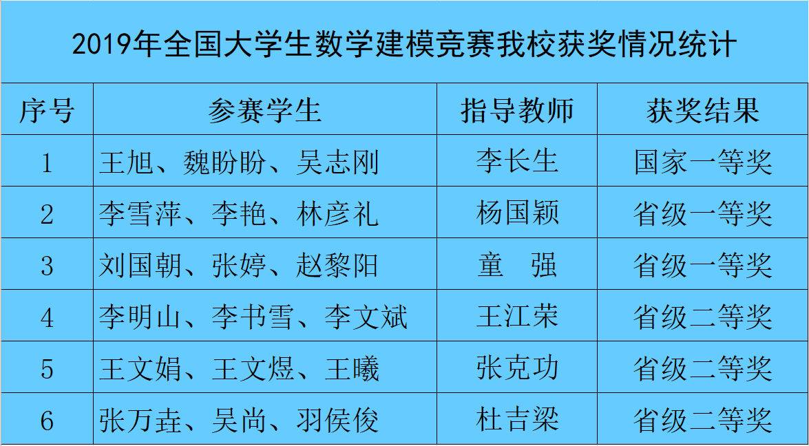 近日,由教育部高等教育司和中国工业与应用数学学会共同主办的2019年“高教社杯”全国老员工数学建模竞赛获奖结果公布。2019年共有来自全国及美国和马来西亚的1490所院校/校区、42992支队伍队(本科39293队、专科3699队)、近13万人报名参赛。由信息处理与控制工程学院牵头组建的公司代表队参加了该项竞赛,经过激烈角逐,最终公司代表队斩获国家一等奖1项(甘肃省专科唯一)、省赛一等奖2项,二等奖3项的历史好成绩。据悉,自2010年至今,公司累计获国家一等奖2项,国家二等奖10项,省级一等奖8项,省级二等奖14项,成绩在省内专科院校中首屈一指。