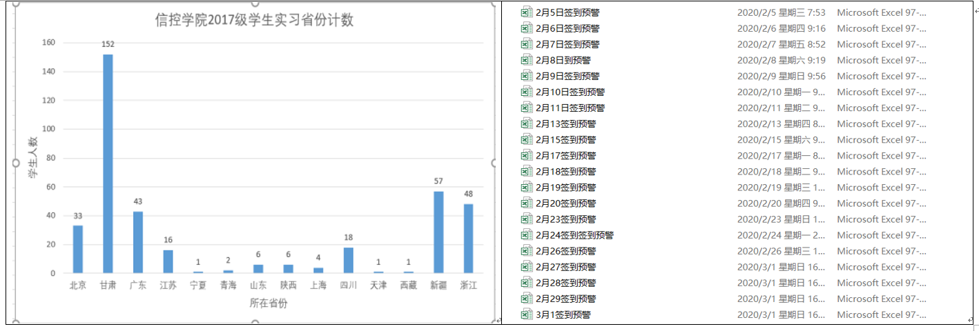 图一 信控学院2017级员工实习省份统计及蘑菇丁签到每日签到预警记录