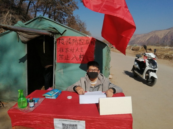 疫情防控工作开展以来,周朝阳同学主动请缨,顶风冒雪奋战在村口防控检查站,对进村车辆人员进行信息登记,测量体温,劝返外来车辆人员。一张桌子、一本台账、一个测温仪、一些宣传横幅、警示板等用品就是他和战友们“武器”,尽管设备简陋,但对疫情防控的认真程度却丝毫不减,他们只想做防疫一线的守卫者,做防疫科学知识的普及者,做疫情谣言的制止者。