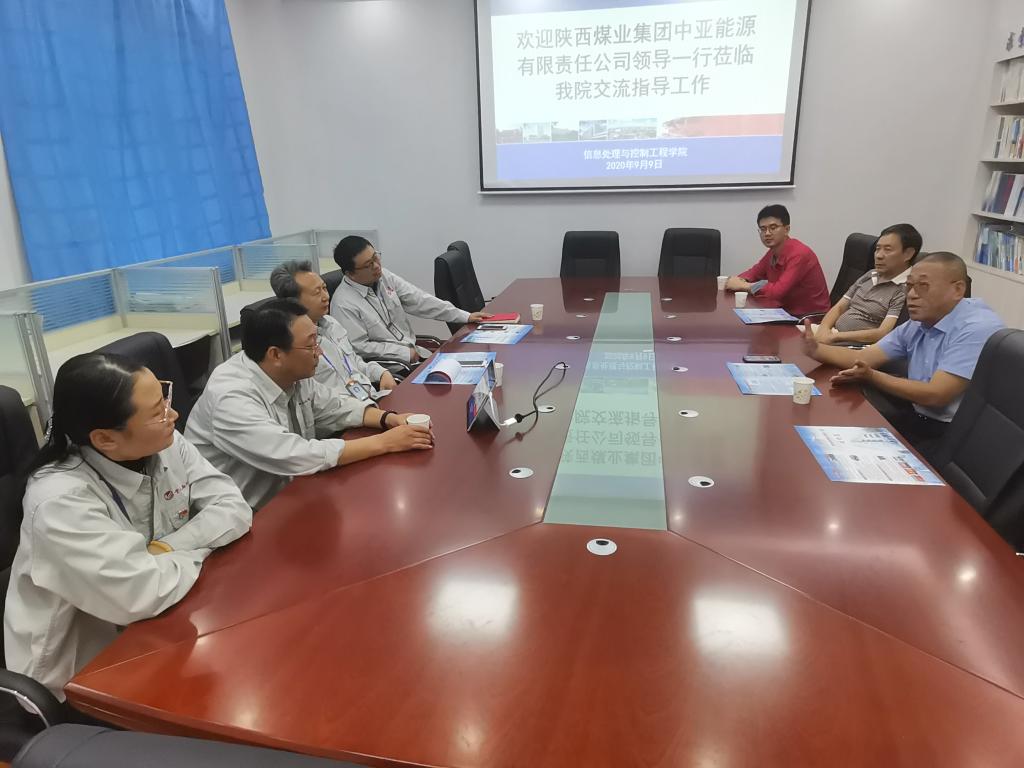 近日,公司党委副书记黄义仿,信息与教育中心主任陪同陕煤集团中亚能源有限责任公司董事长党向红,总经济师兼人力企管部部长吴胜军一行2人到信息处理与控制工程学院教师研修室开展了校企合作交流洽谈。,信息处理与控制工程学院领导参加了座谈会