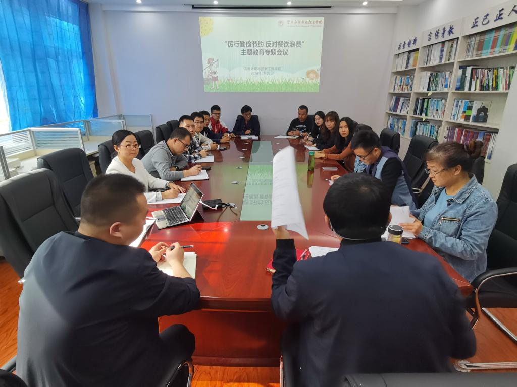 为深入贯彻落实习近平总书记重要指示精神,弘扬勤俭 节约传统美德,结合学校主题教育活动精神,信息处理与控制工程学院组织召开“厉行勤俭节约 反对餐饮浪费”主题教育专题会议,学院主管员工的领导、辅导员、班主任参加本次会议。